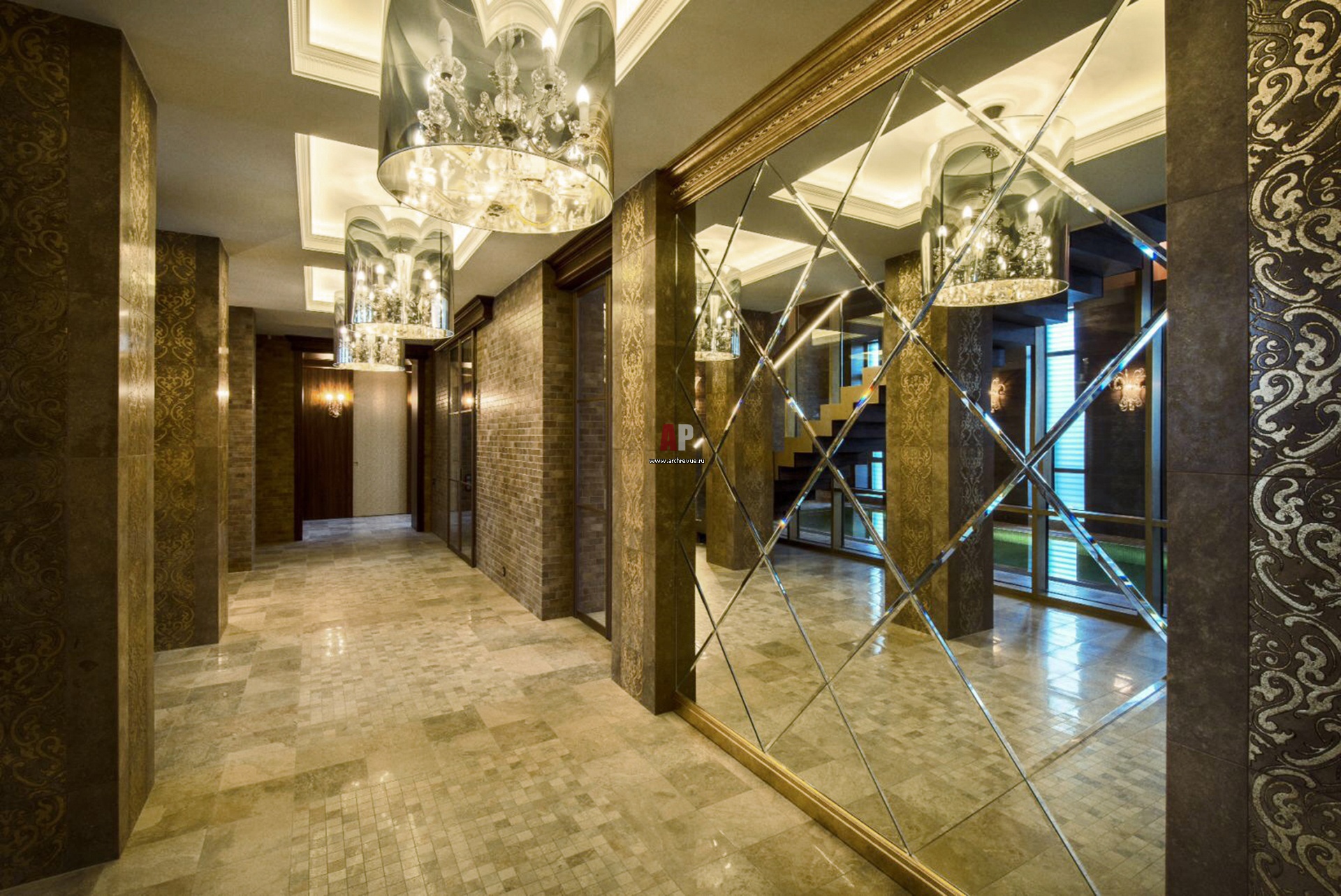 Интерьер входной группы с колоннами. Колонны облицованы плиткой с рельефным орнаментом, который покрыт сусальным золотом. Зеркальное панно с фацетами в классическом стиле.