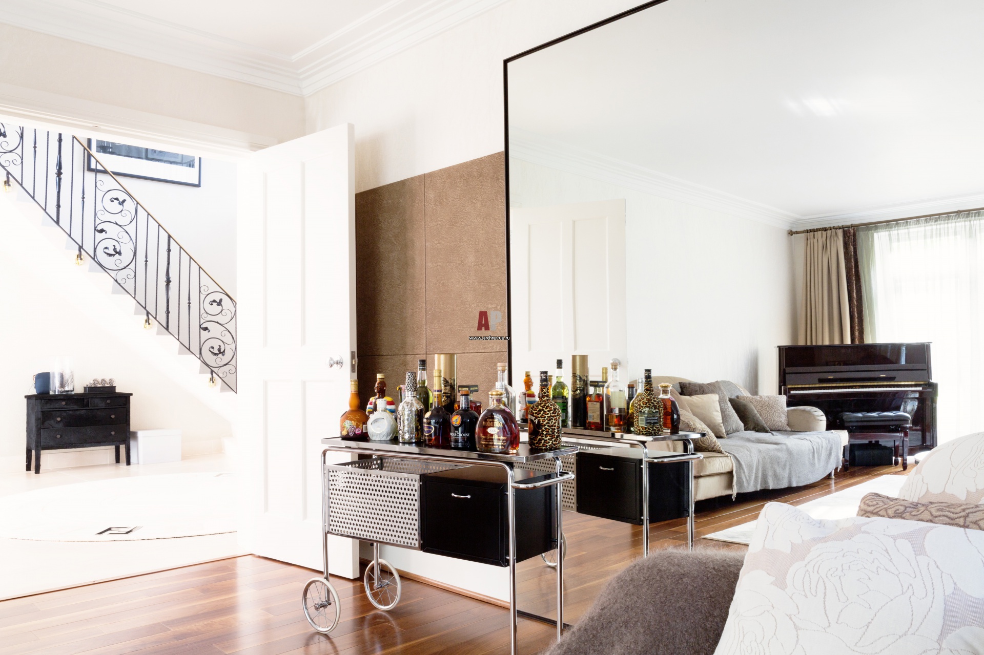 Интерьер музыкального салона. Стены в доме преимущественно крашеные. Стена вокруг огромного зеркала облицована кожаными панелями от Baxter. Ограждение лестницы и балкона выполнено с использованием элементов фабрики Grande Forge (Франция), серия «Кастель». Поставщик, Mercury Forge.