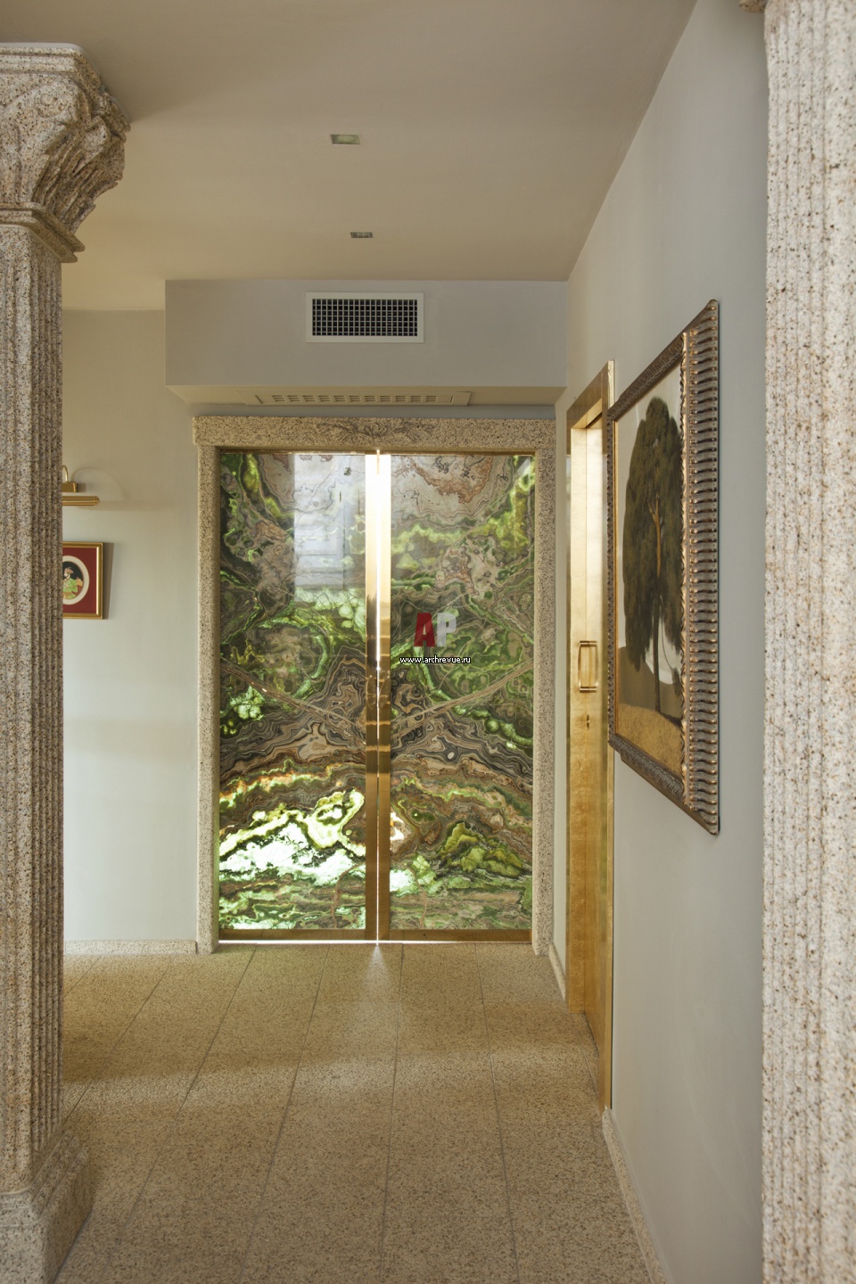 Входная группа с прихожей в парадной части дома. Дверь выполнена из оникса. Неоантичные колонны с резными капителями из гранита.