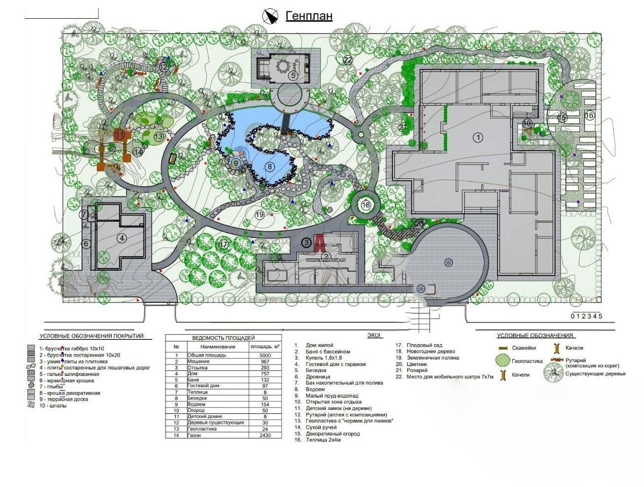 Генплан участка с главным домом, техническими постройками и ландшафтным дизайном.