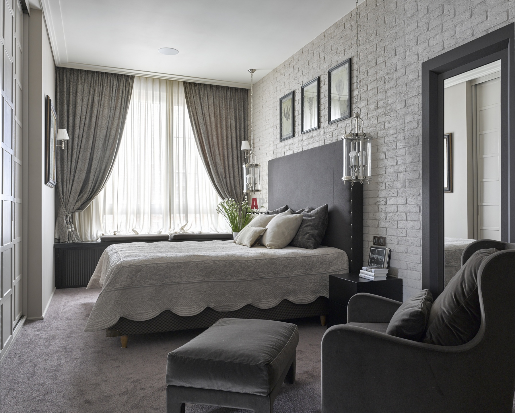 Интерьер родительской спальни. Стена за изголовьем кровати отделана брутальной плиткой. Кровать, King Koil. Тумбы, шкаф, на заказ, изготовление «Ассоциация русских мастеров».