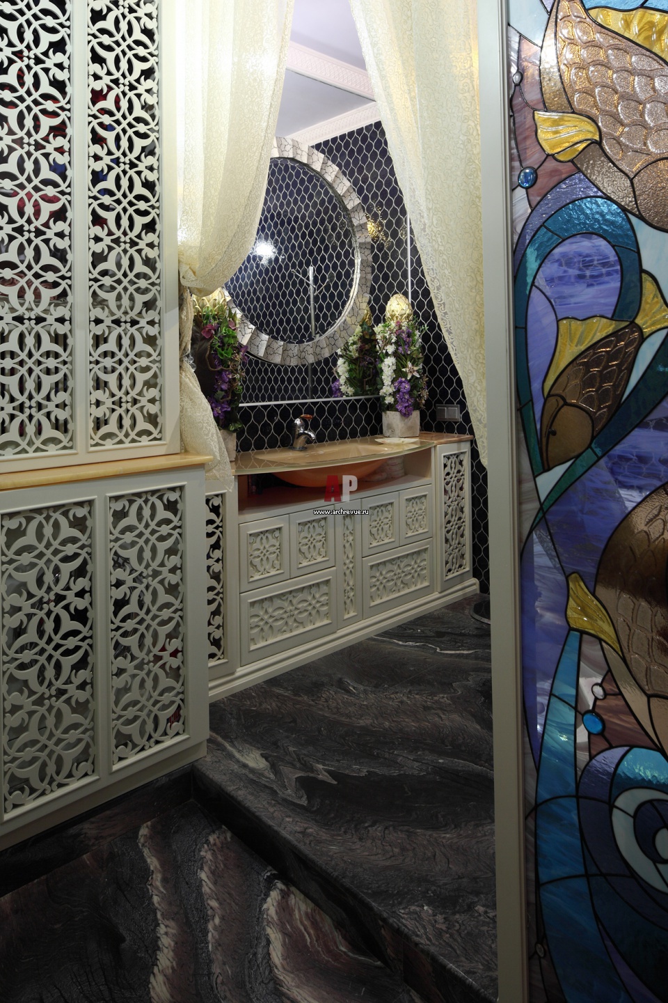Детский санузел решен в восточном стиле. Он декорирован резными деревянными панелями, выкрашенными в белый цвет. Мебель выполнена на заказ по эскизам архитекторов мастерами компании Mobile Line Décor.