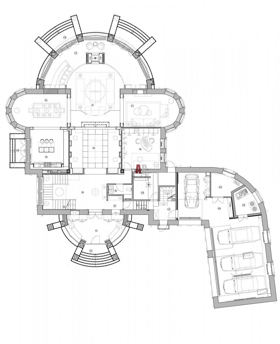 Планировка 1 этажа 3-х этажного особняка в Подмосковье.