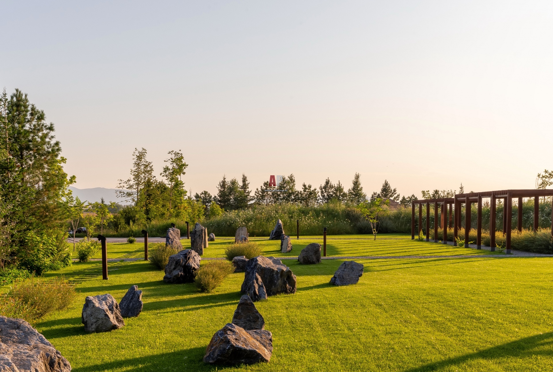 Сад с пологими холмами и крупными деревьями, которые ослабляют потоки ветра, защищает территорию от суровых природных явлений. Массивные серые булыжники – дань особенностям горного региона Русского Севера.