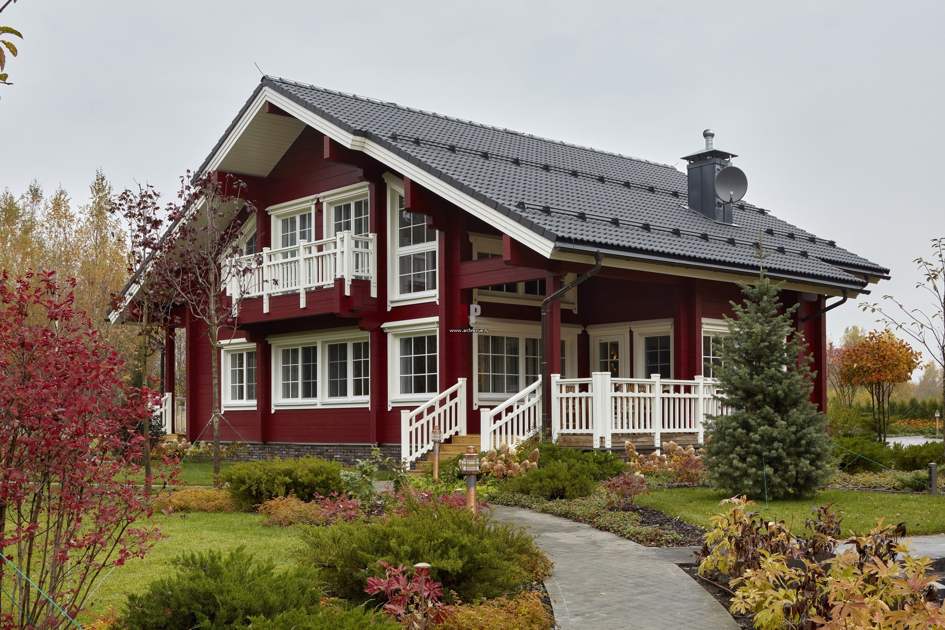 Фасад деревянного дома с ландшафтом. Окна, двери, ограждение балконов и лестниц выкрашены в белый цвет, который выгодно контрастирует с темно-вишневым фасадом.