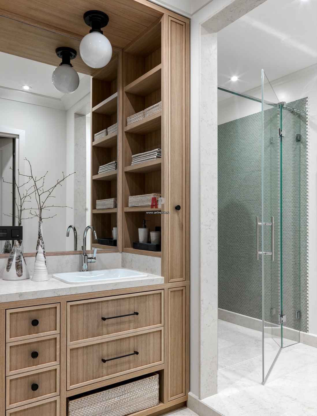 Детский санузел разделен на две зоны: душевая и унитаз размещены в отдельной части помещения, за проемом. Мебель, на заказ. В отделке использован мрамор Bianco Perlino в обработке «лощение».