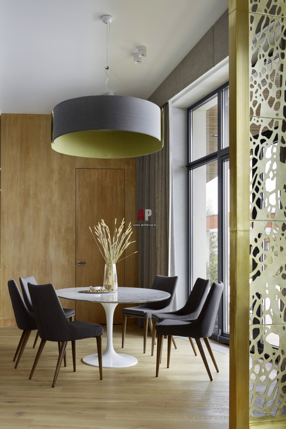 Зона для завтраков на кухне. Стены со скрытой дверью отделана штукатуркой с эффектом ржавого металла. За дверью находится кладовая. Люстра над столом, Modo Luce.