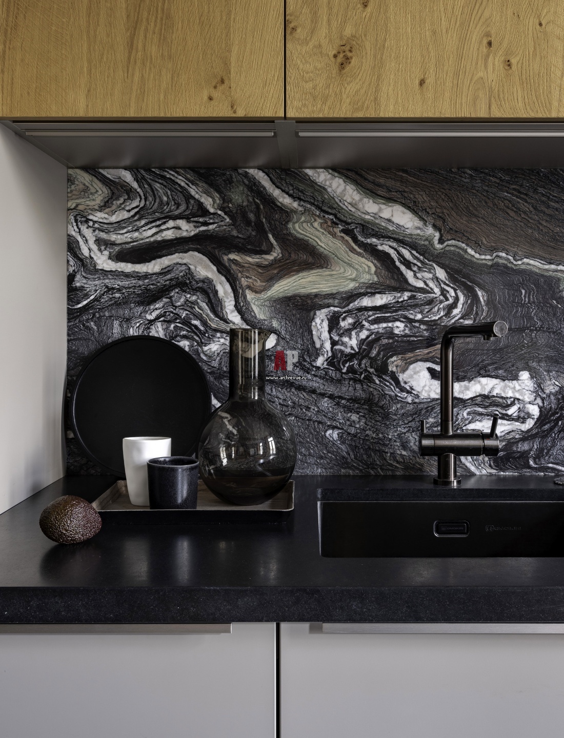 Квартира в доходном доме в темной цветовой палитре. Встроенная кухня, Beckermann. Фартук – мрамор, Chipolino Multicolor.