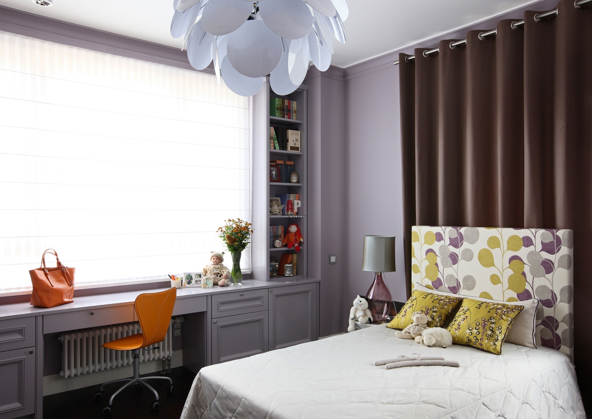 Интерьер детской комнаты младшей дочери выдержан в пастельных сиреневых тонах. Кровать, композиция из рабочего стола, тумбы и стеллажа выполнены на заказ, «Мебельная линия Ирина Бубнова». Стол прикроватный, Molteni&C. Стул, Cattelan Italia.