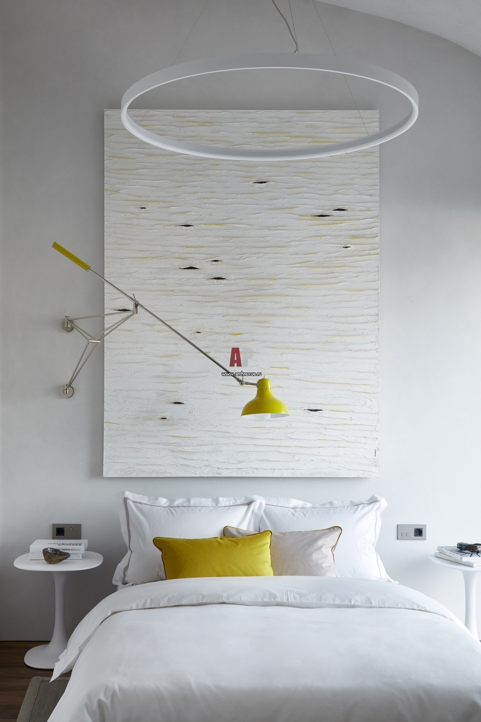 Гостевая спальня на втором этаже. Кровать, Meridiani. Прикроватные столики, B&B Italia. Картина за кроватью, Tashina Bell.