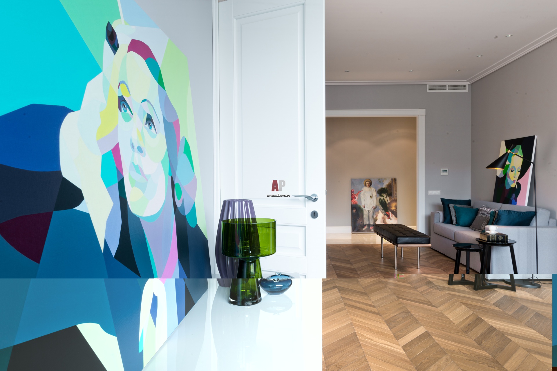 Интерьер гостиной решен лаконично. Стены оклеены однотонными нейтральными обоями. Отделка потолков, краски Little Greene, поставщик «Салон краски». На полу – паркет «французская елка» из дуба.
