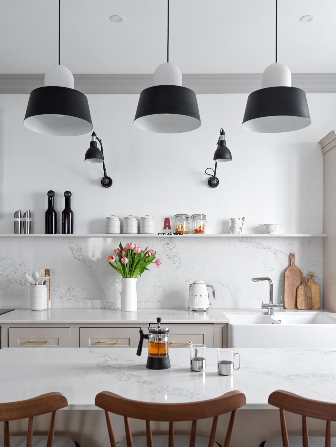 Столешница и фартук кухни отделаны кварцевым агломератом Avant светлого цвета с характерными мраморными прожилками. Вместо навесных шкафов – шкафы-колоны и длинная открытая полка. Этот прием дает ощущение воздуха и простора на кухне.
