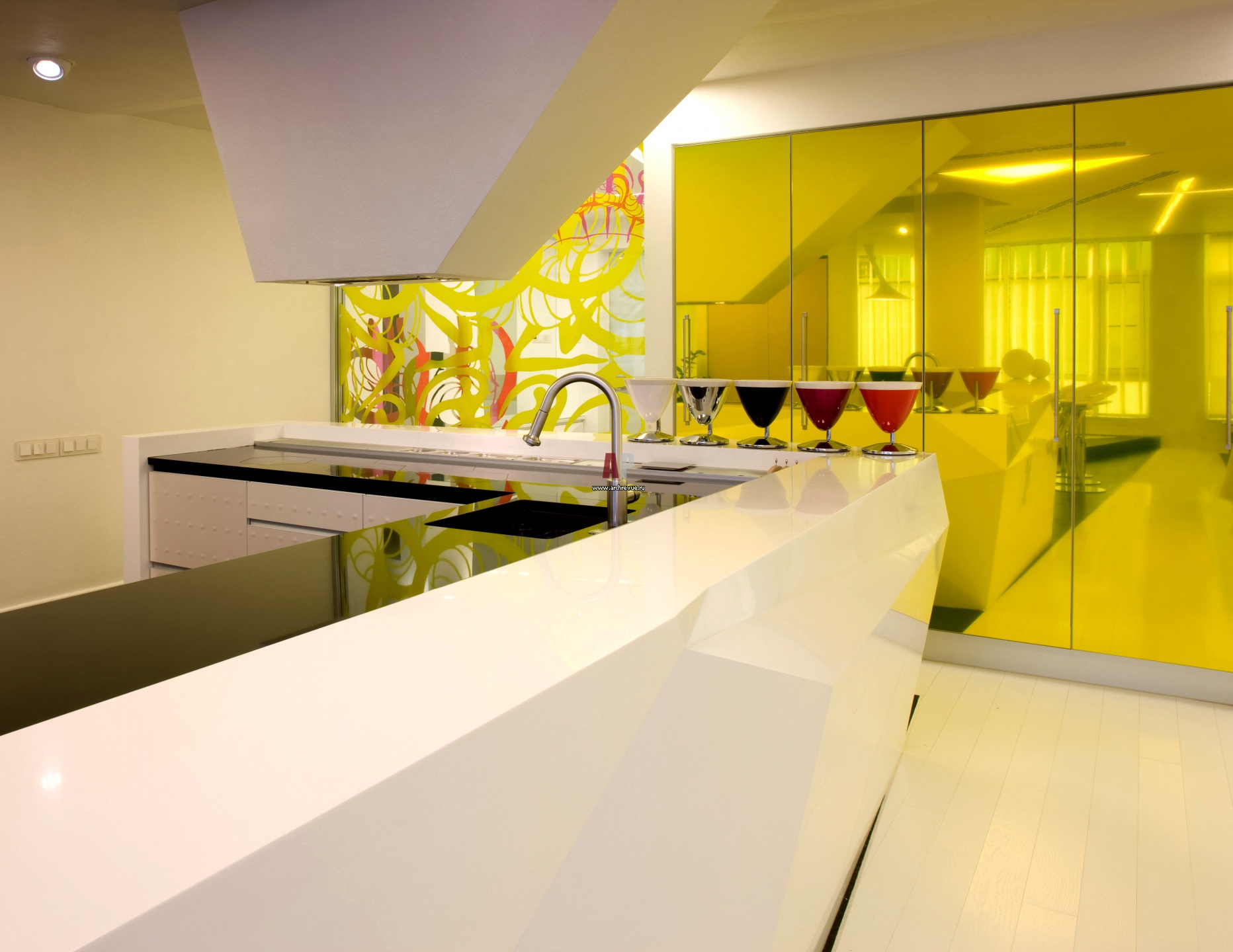 Кухня Valcucine окруженная изломанной оболочкой из искусственного камня и выглядит как арт-объект. Фасады шкафов сделаны из желтого зеркала, оно дает эффект солнечного света.