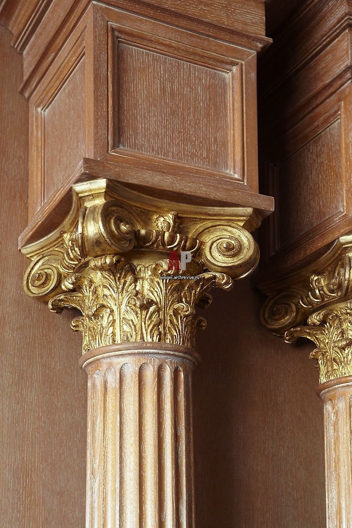 Панели и встроенная мебель Provasi в гостиной и кабинете выполнены из патинированного дуба. Патинирование в светлый тон прекрасно подчеркивает структуру дерева. Парные колонны с золочеными резными капителями, поддерживающие карниз, придают помещению парадный вид.