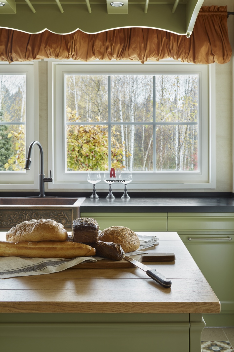 Кухня L'Ottocento с островом и основной угловой композицией. Большое окно, вдоль которого располагается рабочая зона, обращено в сад. В проем окна встроена подсветка, позволяющая в темный или пасмурный «включить солнце».