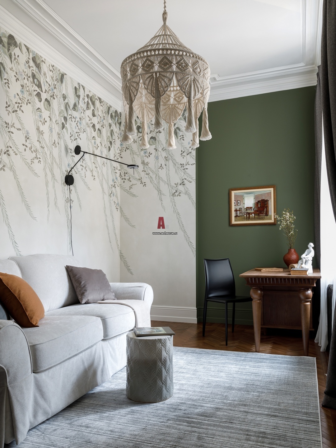 В оформлении кабинета прослеживается отсылка к природе. Одна стена декорирована обоями с крупным растительным принтом, остальные выкрашены в теплый оливковый цвет. Светильник выполнен в технике макраме, он легкий и рифмуется с рисунком на стене.