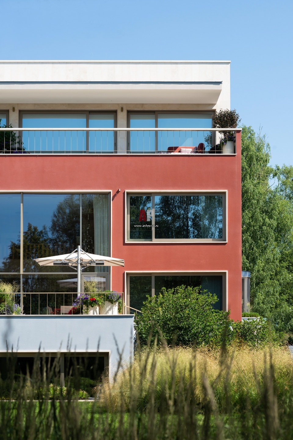 Здание отличает нетипичный для подмосковных домов цвет. Главные фасады, северный и южный, покрыты терракотовой штукатуркой Kourasanit.