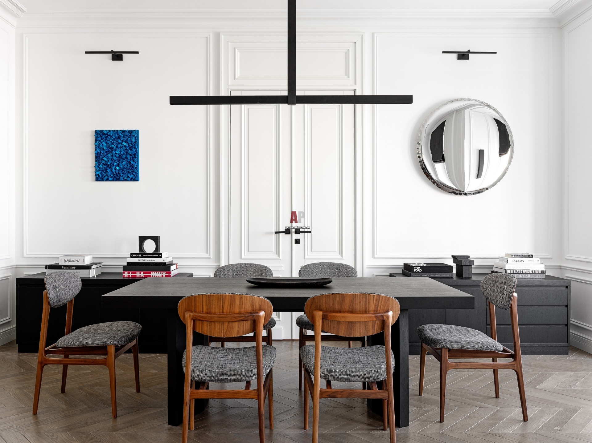 Зона столовой. Стол, шпон дуба тонированный, изготовлен на заказ по эскизам дизайнера. Люстра Michael Anastassiades, модель Vertigo. Стулья, Dale Italia, модель Agio обиты тканью Dedar. Дверные ручки, Formani, поставщик EMPORIO.ru