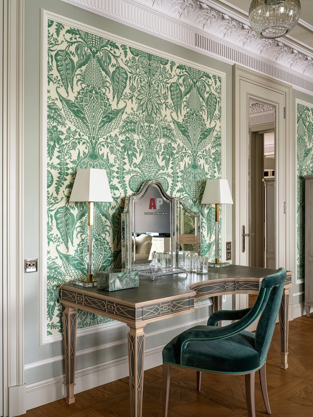 Резиденция в стиле парадной неоклассики в Санкт-Петербурге. Интерьер хозяйской спальни. Обои с растительным орнаментом в изумрудных тонах заключены в белые багетные рамы.