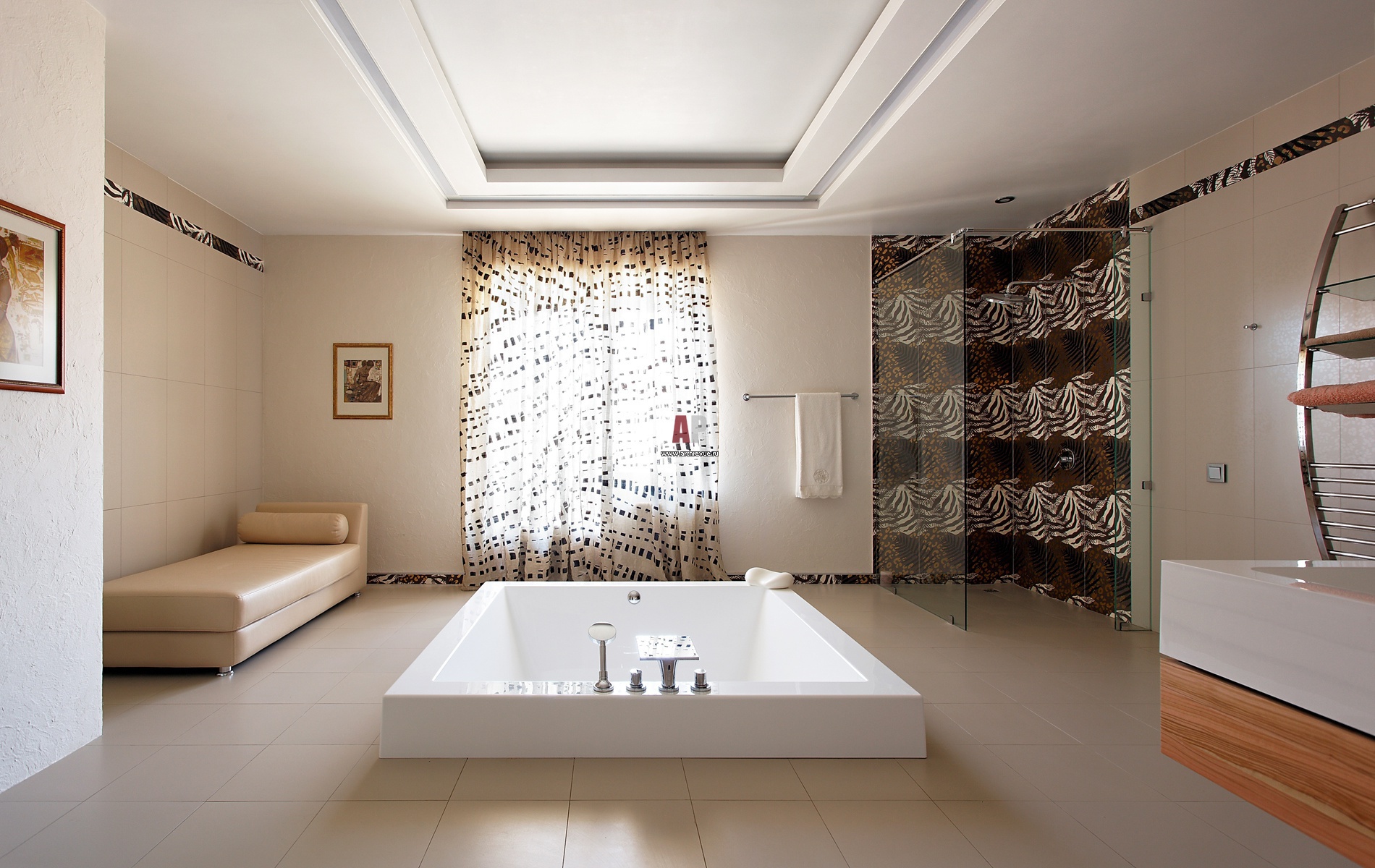 Из спальни хозяев можно попасть в главную ванную комнату – большое (28 кв. м) помещение с ванной, душевой кабиной, диваном для отдыха.