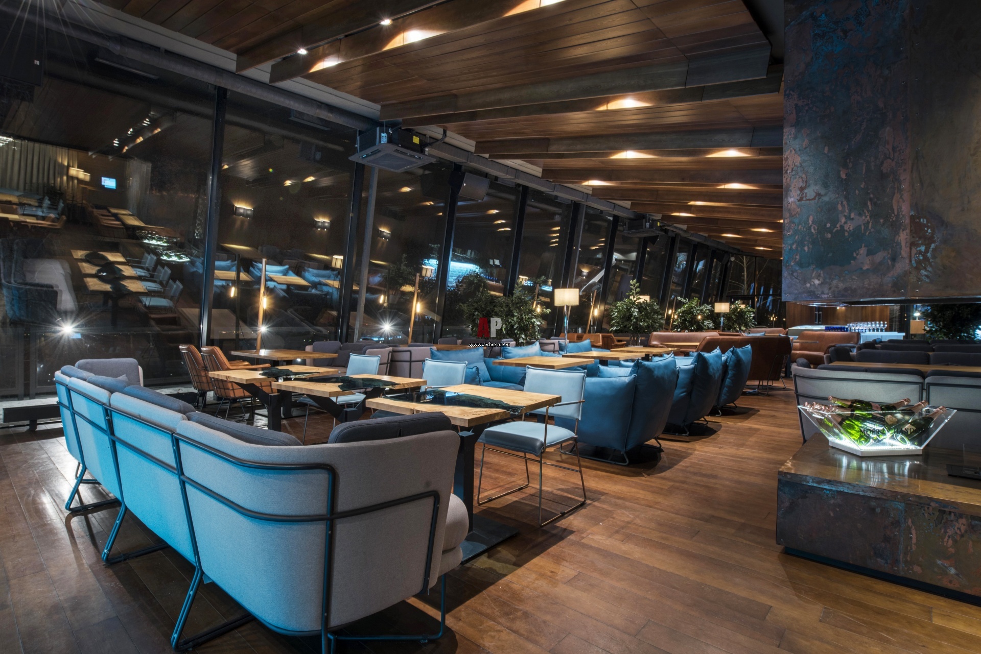 Интерьер видового ресторана Tiffani Bar с вечерней подсветкой.