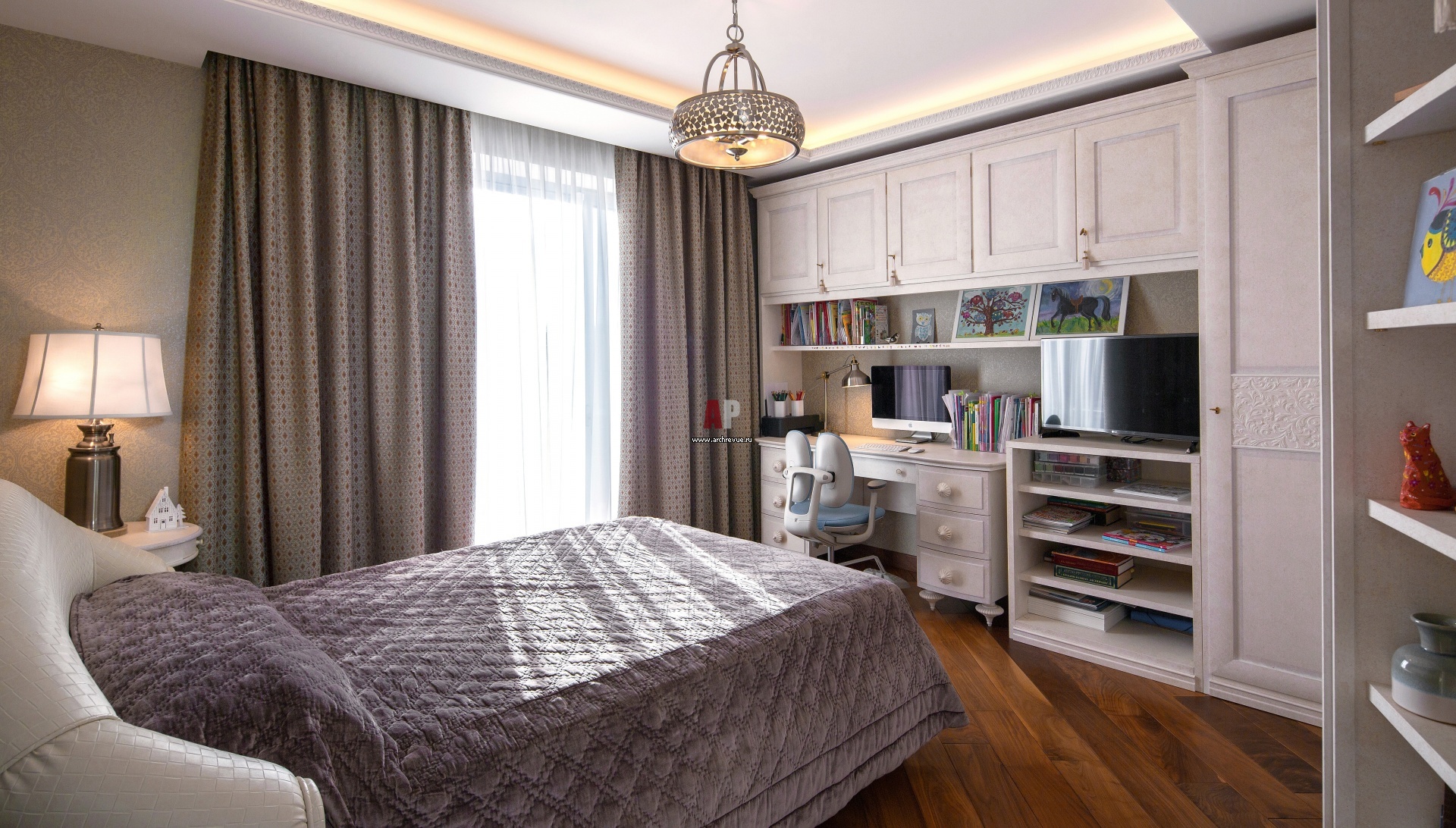 Детская комната одной из дочерей исполнена в современной классике с легкими сиреневыми нотами. Кровать, система хранения, Ferretti & Ferretti.