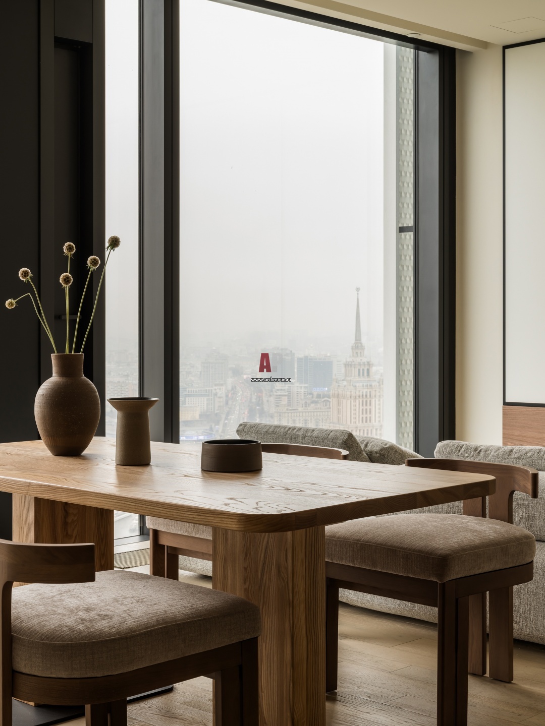 В гостиной дизайнеры намеренно отказались от оформления окон текстилем, чтобы сохранить возможность любоваться видом на город круглые сутки.