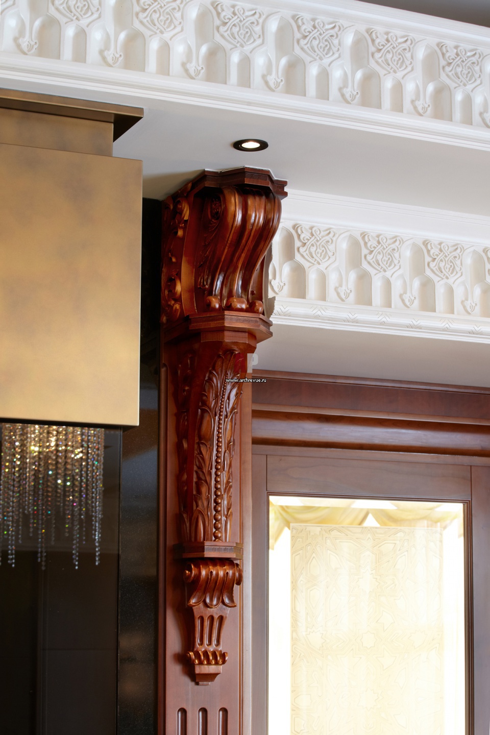Фрагмент оформления зоны камина. Резьба по дереву, гипсовый декор, стеклянный витраж – все в восточной стилистике, ручная работа российских мастеров.