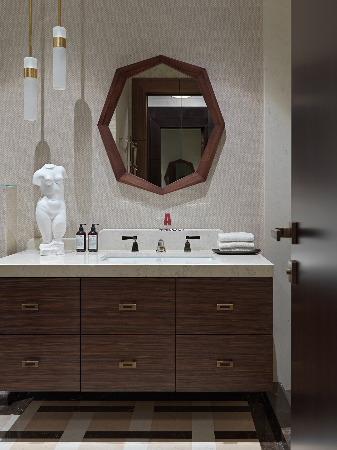 Хозяйский санузел выглядит строго за счет контраста светлого мрамора и темного дерева. Тумба под раковину сделана на заказ. Санфаянс, Villeroy & Boch.