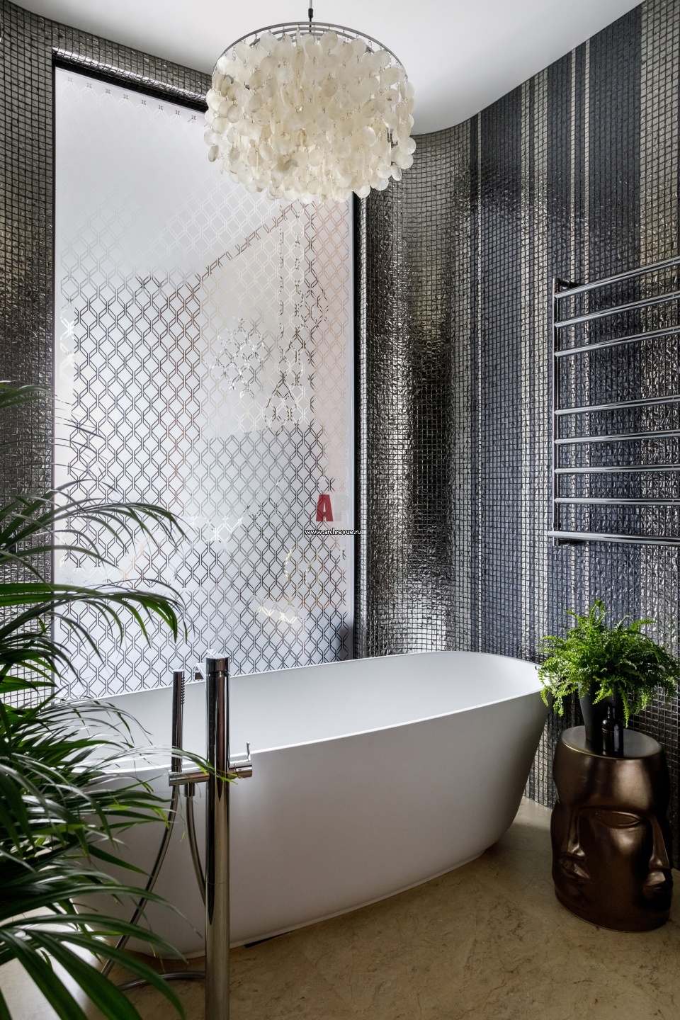 Для перегородки дизайнер сначала хотела использовать smart-стекло, но потом решила установить декоративное – прозрачное с пескоструйной гравировкой. Орнамент из мелкой сетки она нарисовала вручную с учетом сохранения приватности.
