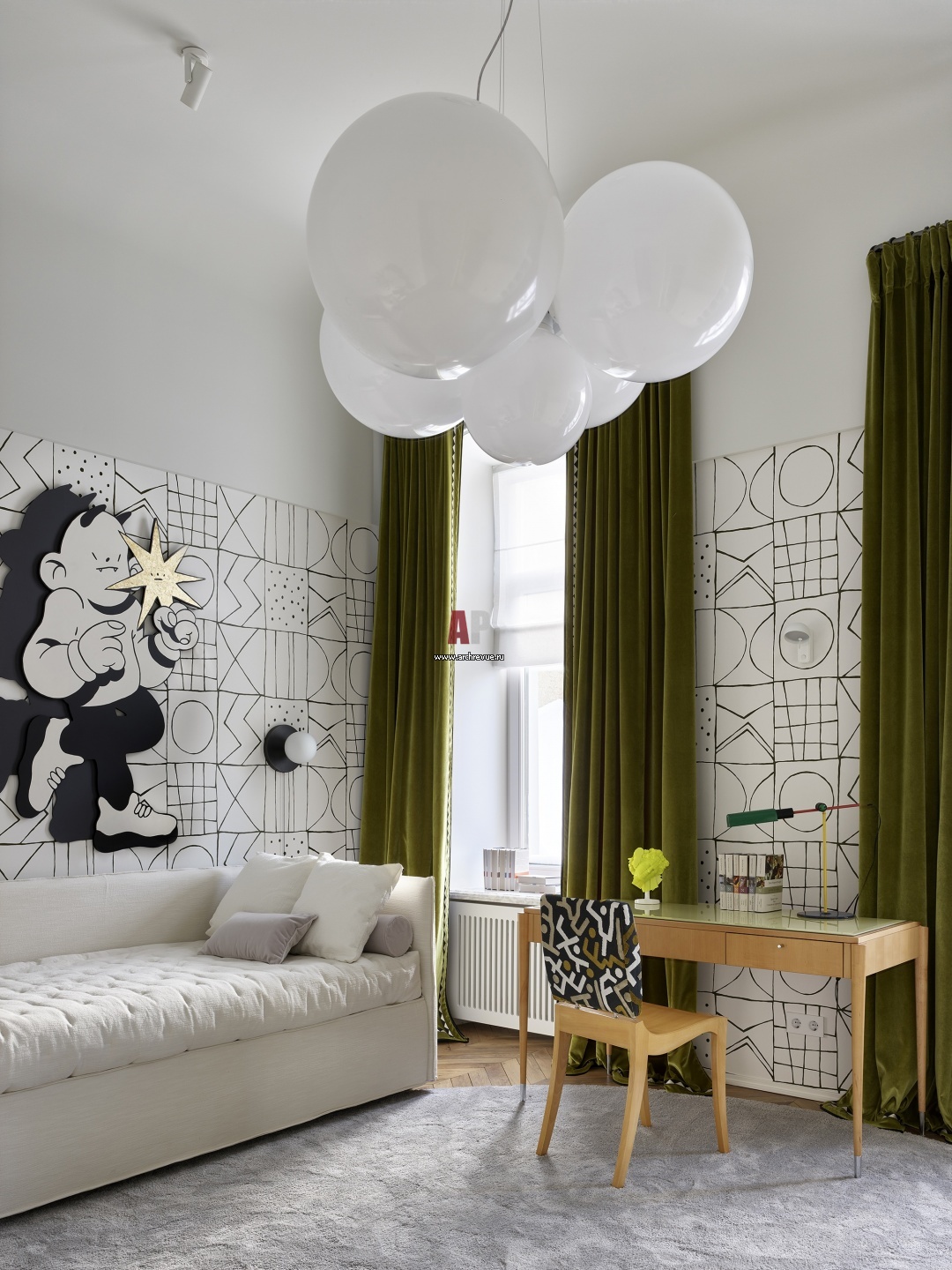 В дальней части квартиры расположены спальни для двоих детей. В каждой комнате есть кровати Alternotti, места для учебы, книжные шкафы и системы хранения. Первая детская оформлена в бело-зеленой цветовой гамме. Люстра в форме белых шаров, Axo Light, по дизайну Димы Логинова.