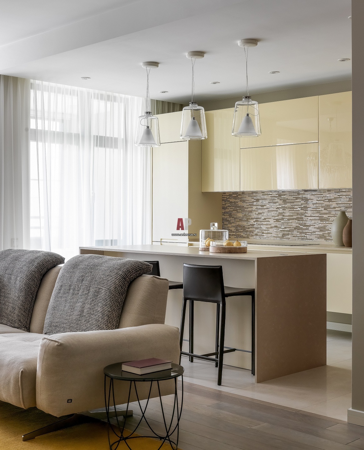 Кухня объединена с гостиной в одно светлое и воздушное пространство.
