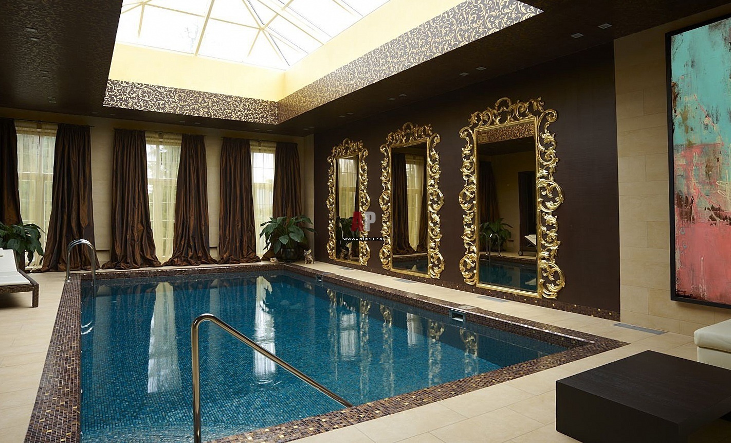 Зона СПА с бассейном занимает отдельное крыло. Шоколадно-голубая цветовая гамма создает комфортную для отдыха цветовую среду. Пространство визуально увеличивают панорамные окна, стеклянный купол и три одинаковых зеркала в необарочных пышных рамах.