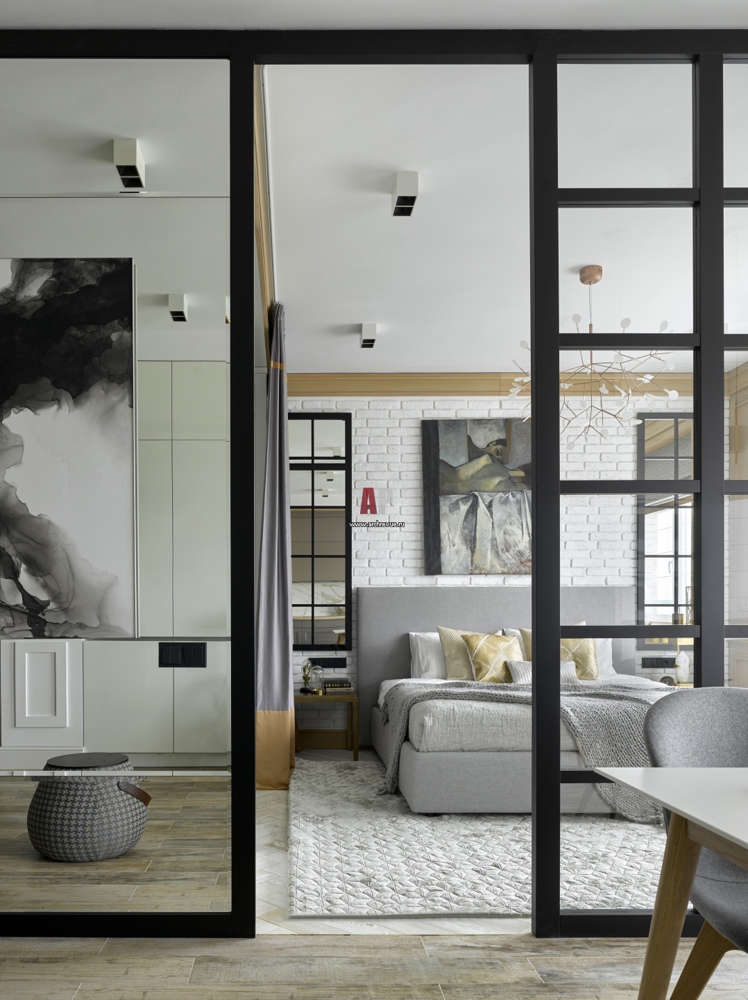 Со стороны кухни перегородка переходит в зеркальную стену. За перегородкой предусмотрена штора, которая передвигается по направляющим и может выполнять несколько задач: изолировать гардеробную, спальню или все зоны сразу.