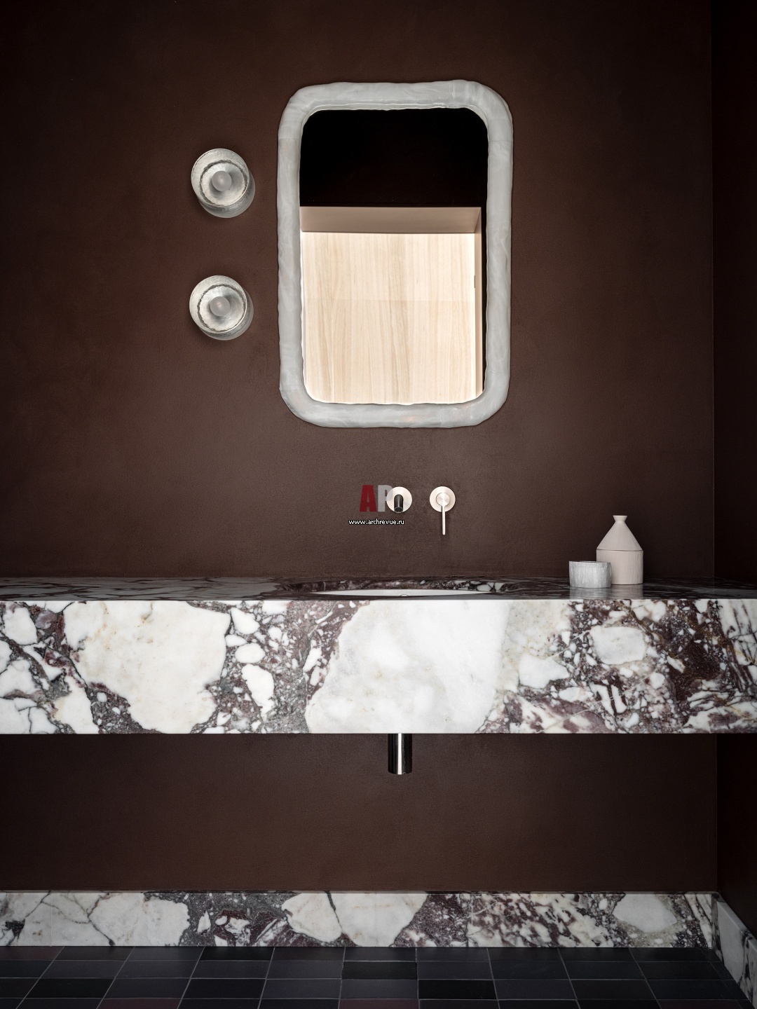Гостевой санузел. Зеркало по эскизам дизайнеров. Бра, Volker Haug Studio. Сантехника, Cea.
