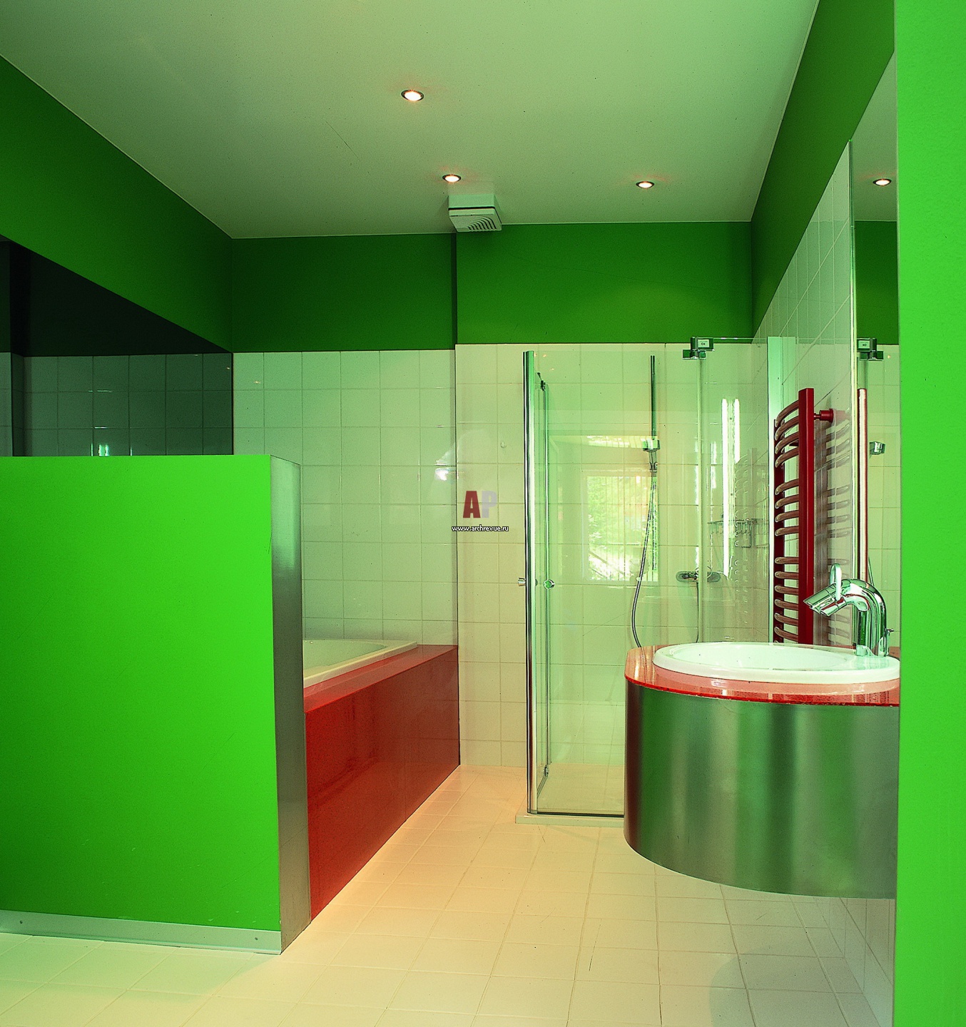 Фото интерьера ванной комнаты при одной из детских комнат, решенного на контрасте зеленого и красного цветов. Округлая столешница раковины декорирована листами из нержавеющей стали.