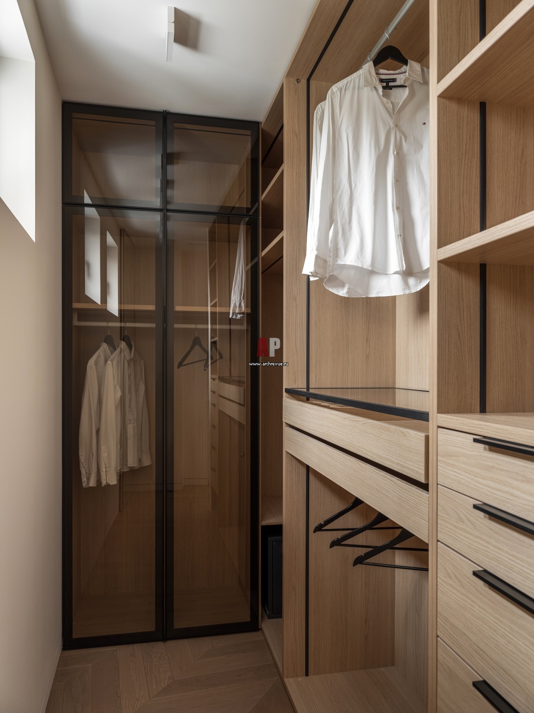 Гардеробная при хозяйской спальне в отделке светлым дубом.