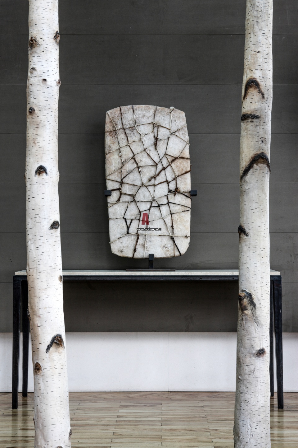 С фактурой коры березы сочетается плафон лампы из камня и металлической нити.