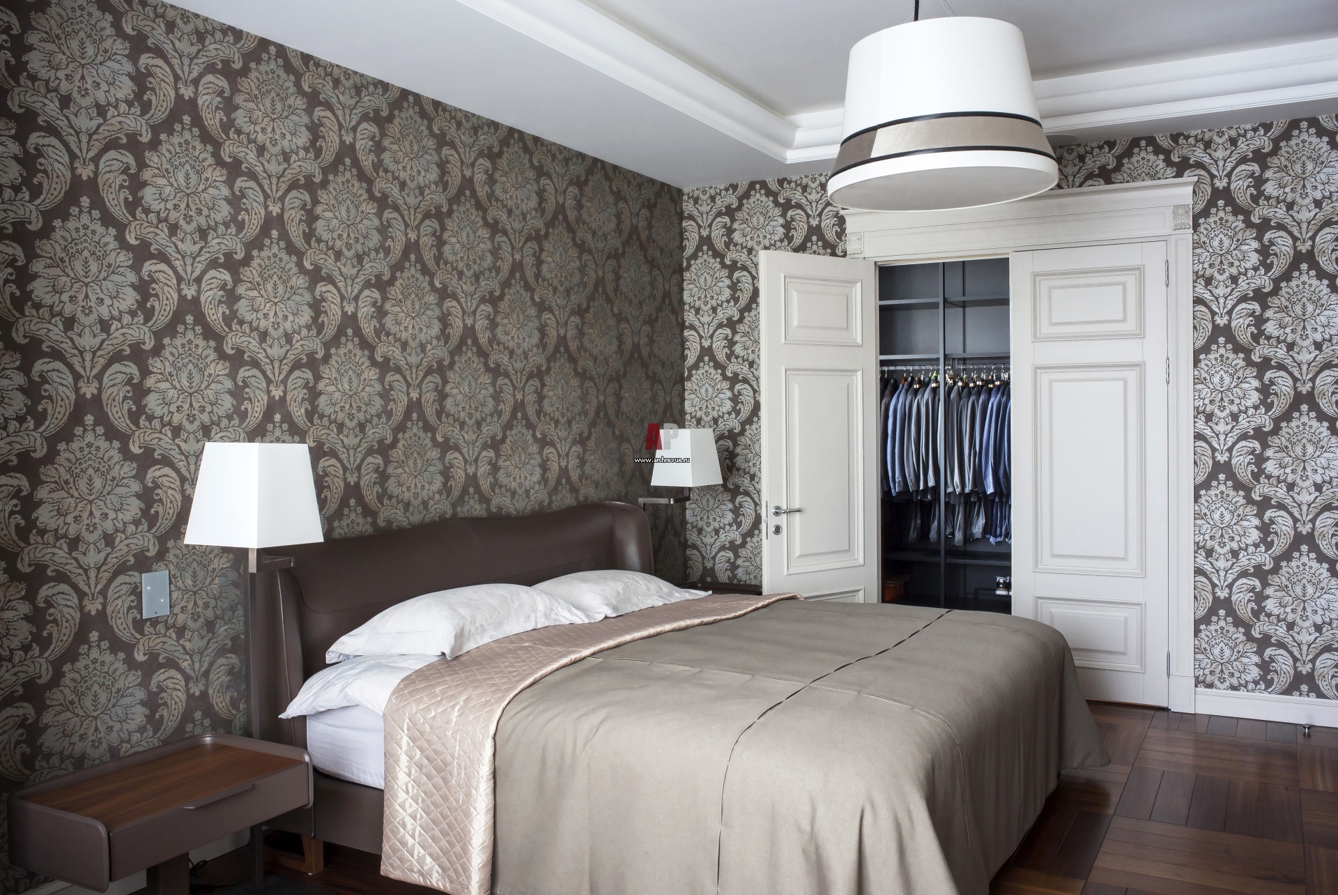 Интерьер мужской спальни. Встроенный шкаф с неоклассическими филенками, на заказ, изготовление «АФ Ника». Кроватью, Giorgetti.