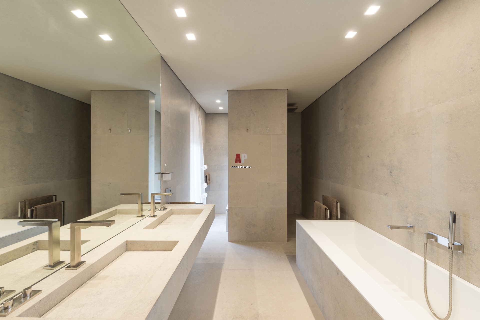 Дизайн-проект интерьера ванной комнаты в стиле минимализм. Стены облицованы светлым камнем, немецкая сантехника с платиновой фурнитурой.