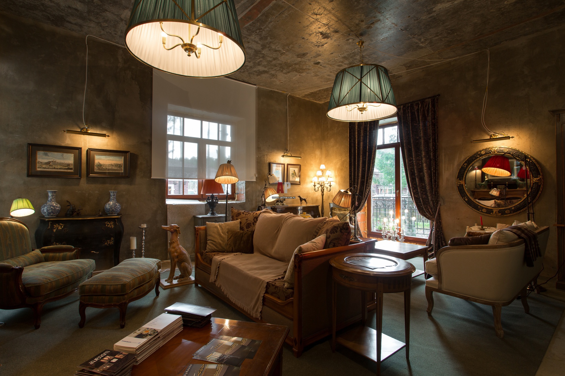 Фото интерьера гостиной в стиле винтаж. Стены выкрашены декоративными составами «под бетон». Шторы из плотной ткани, Nobilis. Ковролин из 100%-ной некрашенной овечьей шерсти, Agnella.