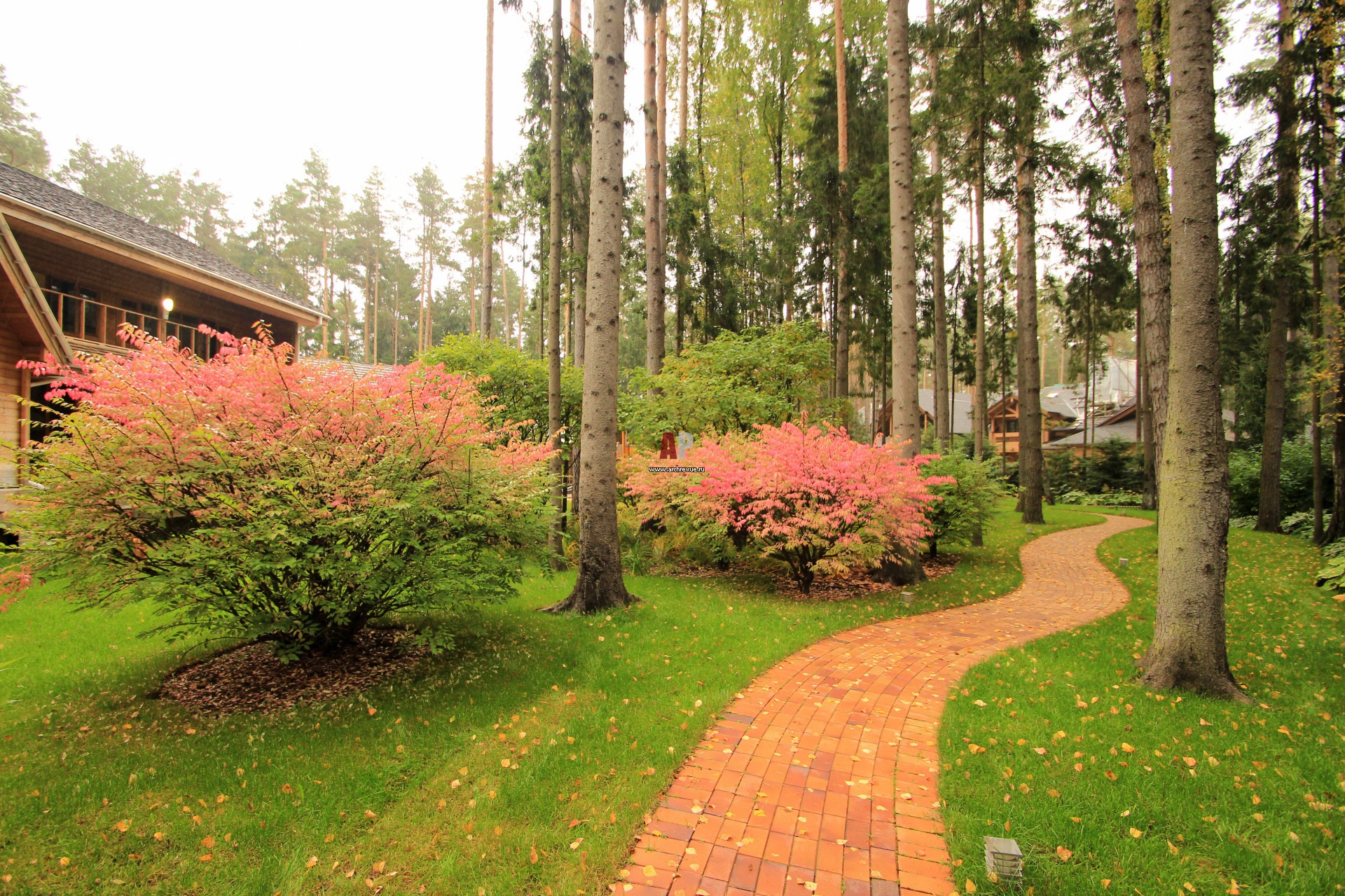 Большая затененность расположенного в лесу участка определила выбор в пользу растений, который хорошо переносят тень. В их числе: тсуга канадская, бересклет крылатый, ирга Ламарка, рододендроны.