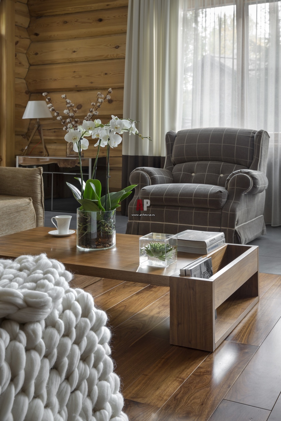 Интерьер деревянного дома в современном стиле. Аксессуары, посуда, вазы, поставщик Crate and Barrel.