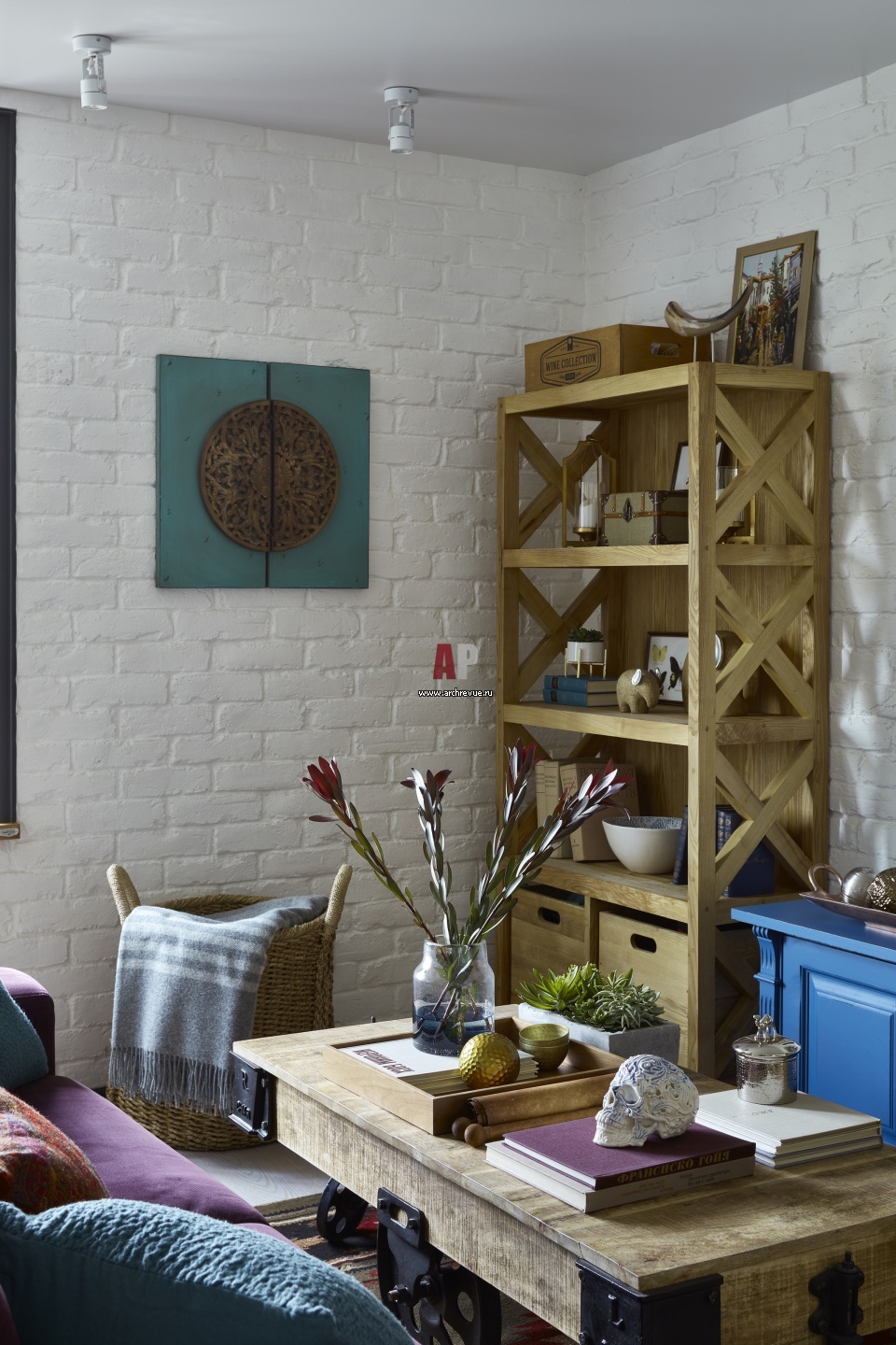Эклектичная квартира с этническим декором для девушки. Интерьер гостиной.