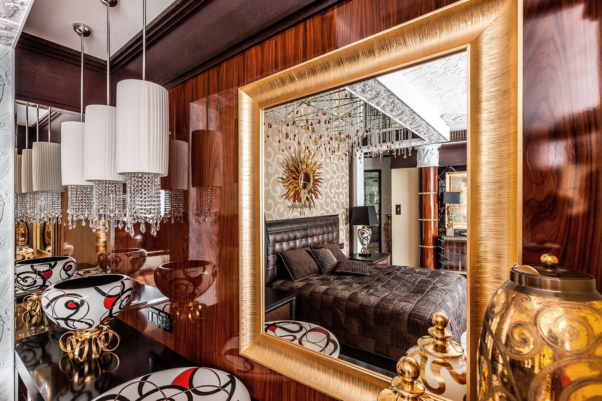 Интерьер спальни выполнен в стиле ар-деко. Стены зашиты панелями из полированного палисандра, он сочетается с темным венге в отделке дверей и мебели, а также светлым зебрано в облицовке пола. Зеркало над кроватью, Christopher Guy.