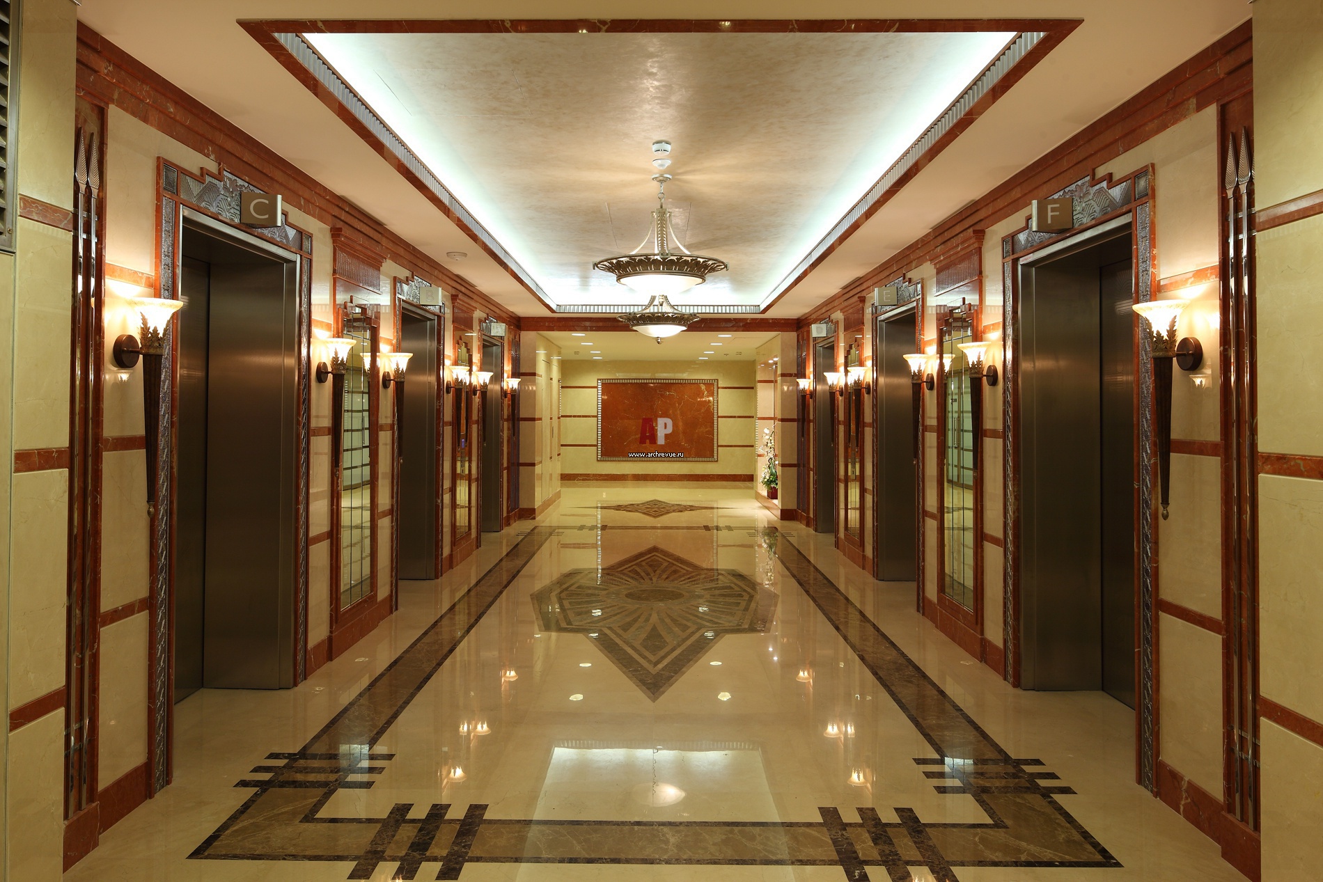 В лифтовом холле полы и стены выложены мрамором. Двери лифта и порталы выполнены на заказ по эскизам архитекторов из нержавеющей стали с гравировкой.