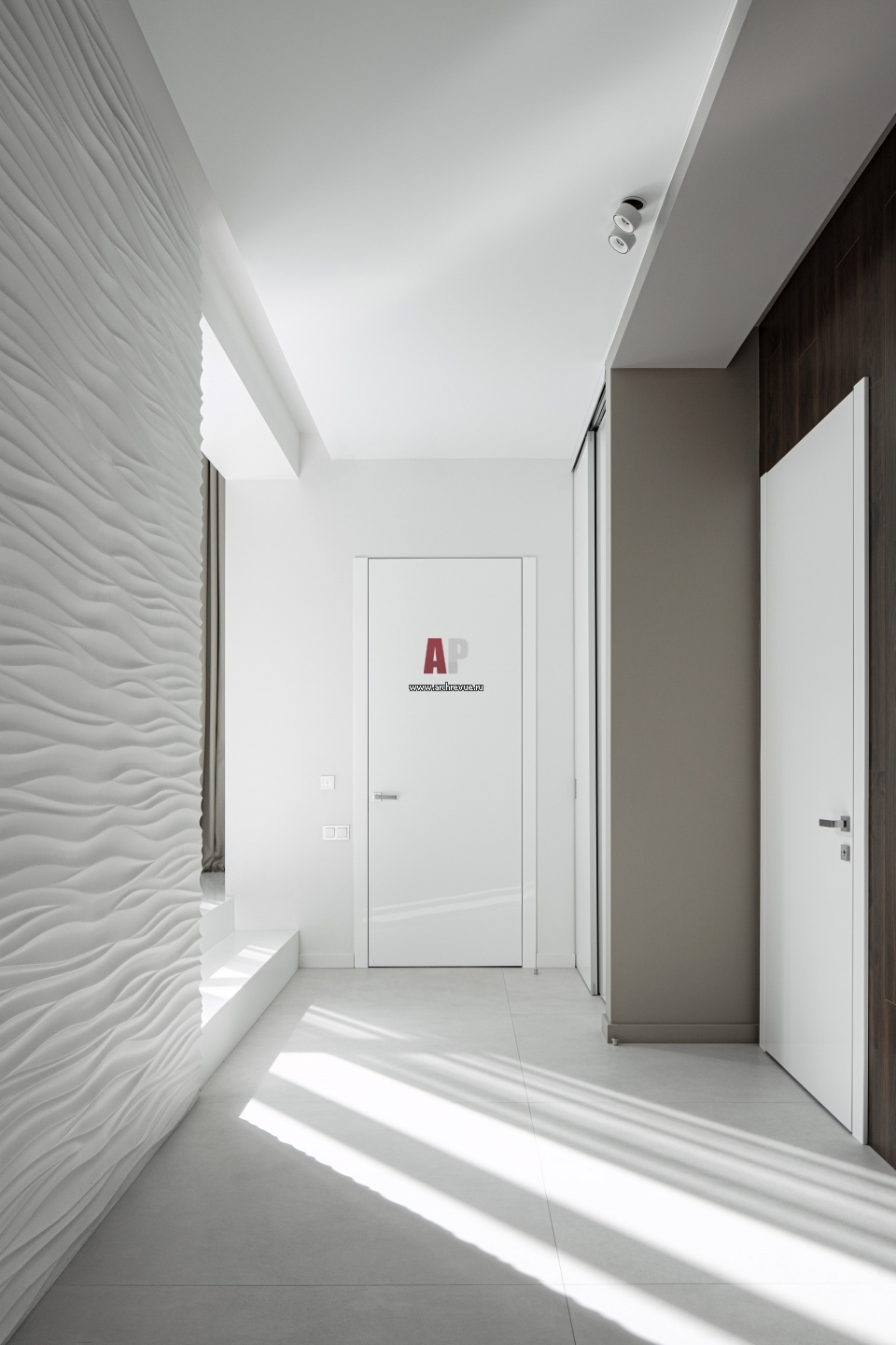 В холлах использовано сочетание однотонной окраски стен, белых глянцевых дверей и 3D-панелей с рисунком в виде волны.