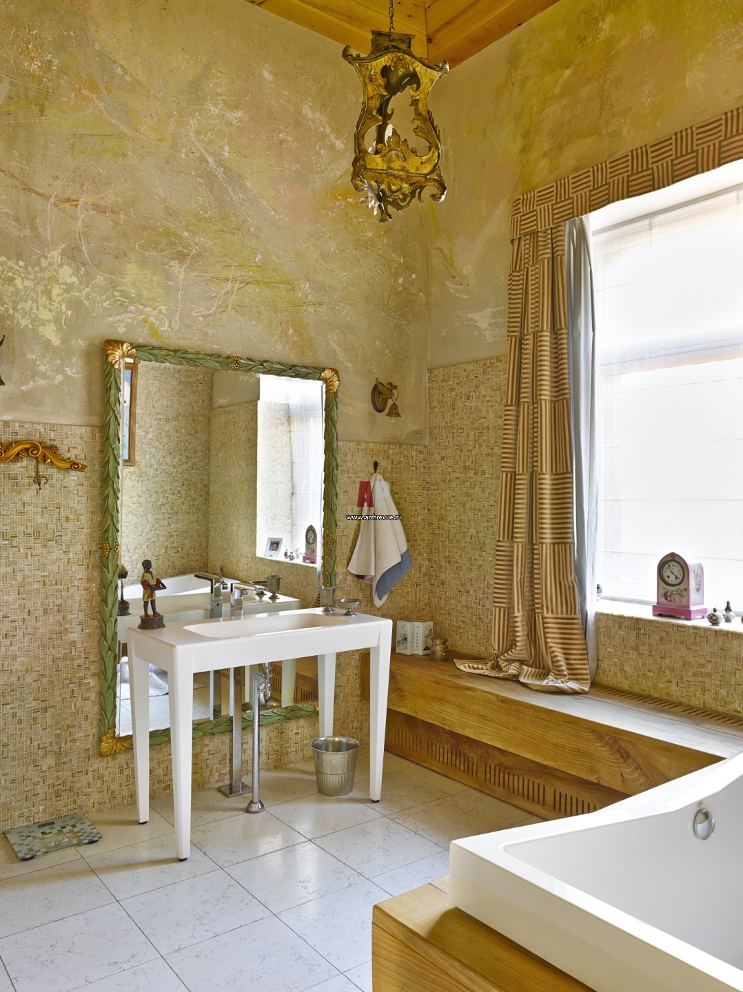 Хозяйская ванная комната. Стены помещения облицованы мозаикой из оникса. Ванна встроена в деревянный подиум.