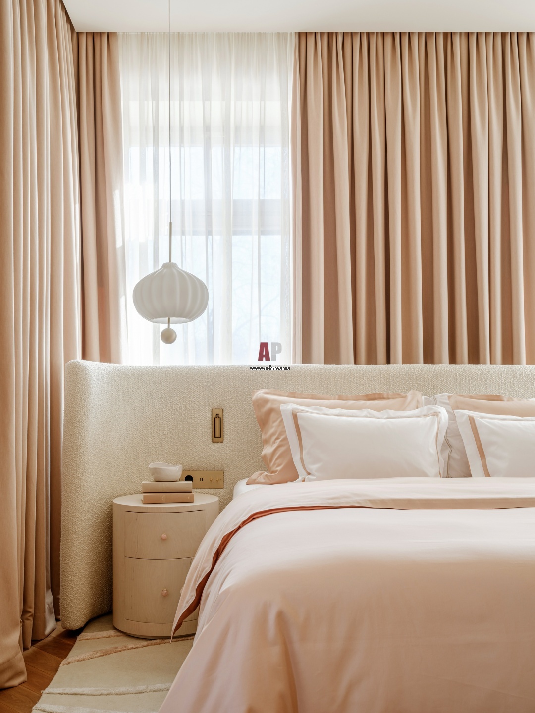 Стены и потолок спальни окрашены в сложный розовый оттенок. Люстры прикроватные, Kundalini.