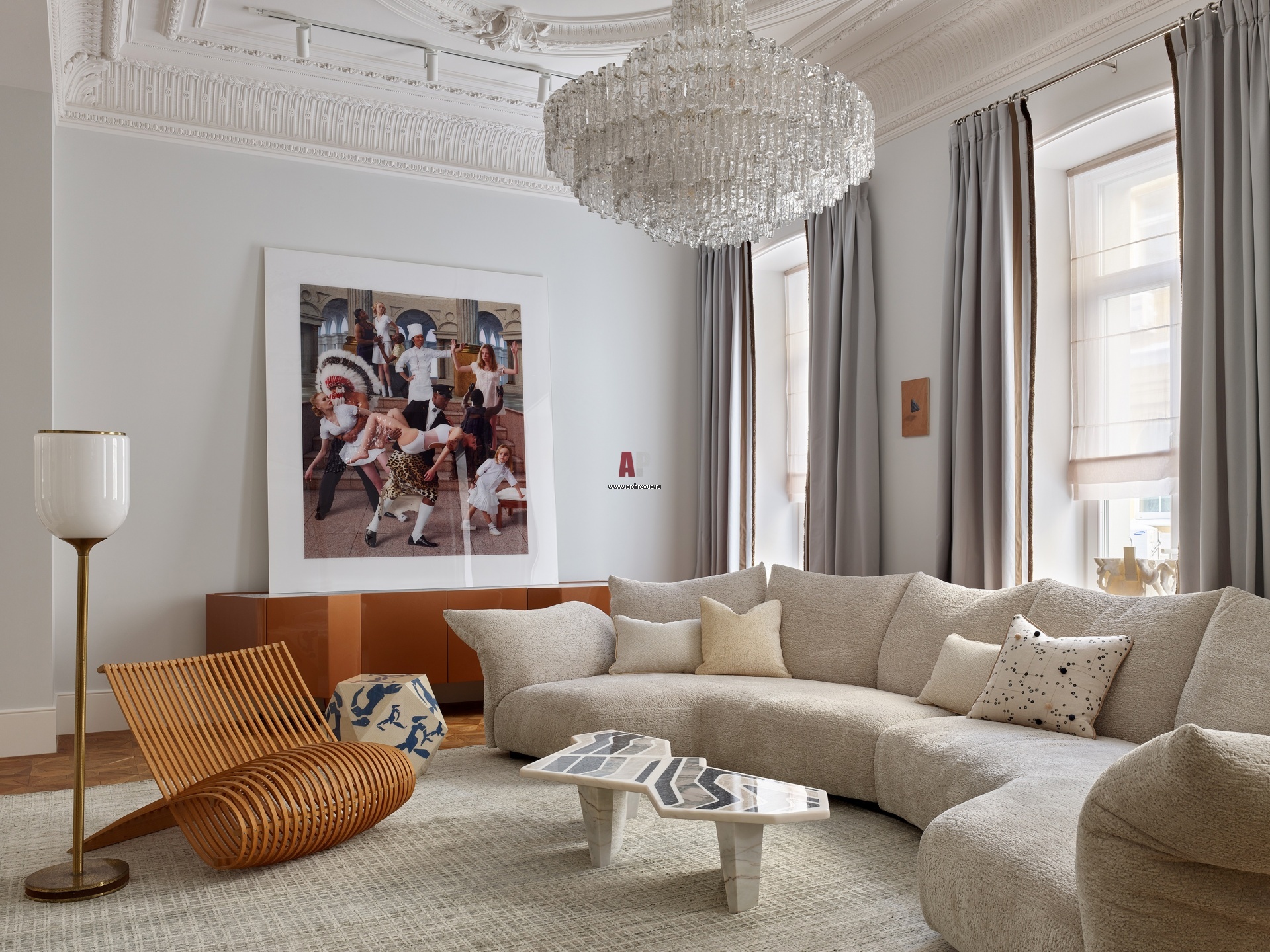Гостиная. Диван, Edra. Журнальный столик, Hommés Studio. Торшер и люстра, винтаж. Кресло, Cornelio Cappellini, по дизайну Марка Ньюсона. Шкаф, Cornelio Cappellini. Масштабная винтажная люстра 1970-х годов.